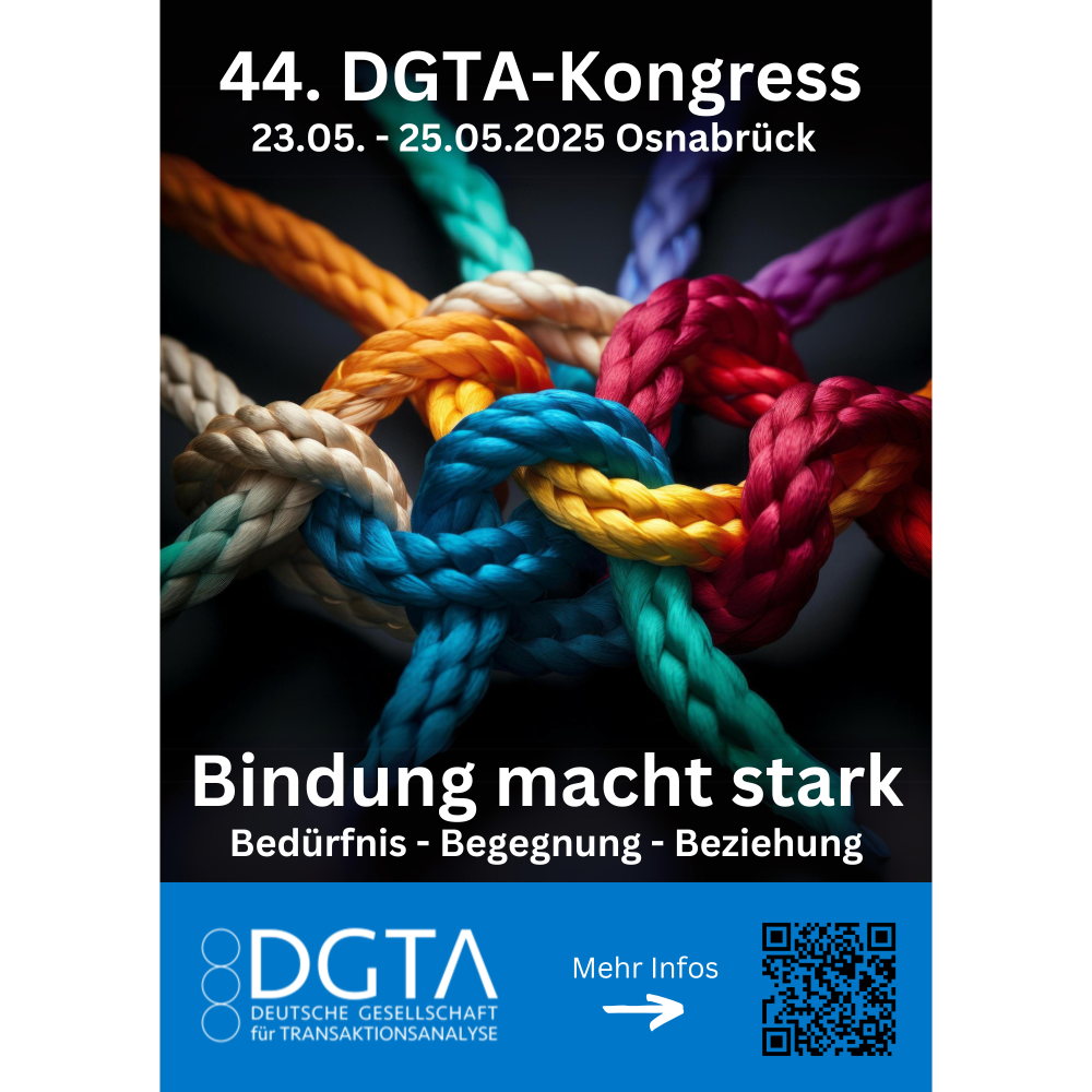 23. bis 25. Mai 2025 lädt die Deutsche Gesellschaft für Transaktionsanalyse (DGTA) zum 44. Kongress nach Osnabrück ein. Unter dem Motto „Bindung macht stark – Bedürfnis – Begegnung – Beziehung“ werden wir die zentrale Rolle der Transaktionsanalyse in der Förderung von Toleranz und Respekt in unserer Gesellschaft beleuchten.